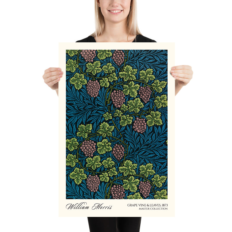 For a curated, gallery-wall look, you may opt to include the artist’s name and the pattern title—“William Morris • Grape Vine & Leaves”—either above or below the artwork. This tasteful typographic detail can help anchor a collection or add a scholarly touch to a single statement piece.