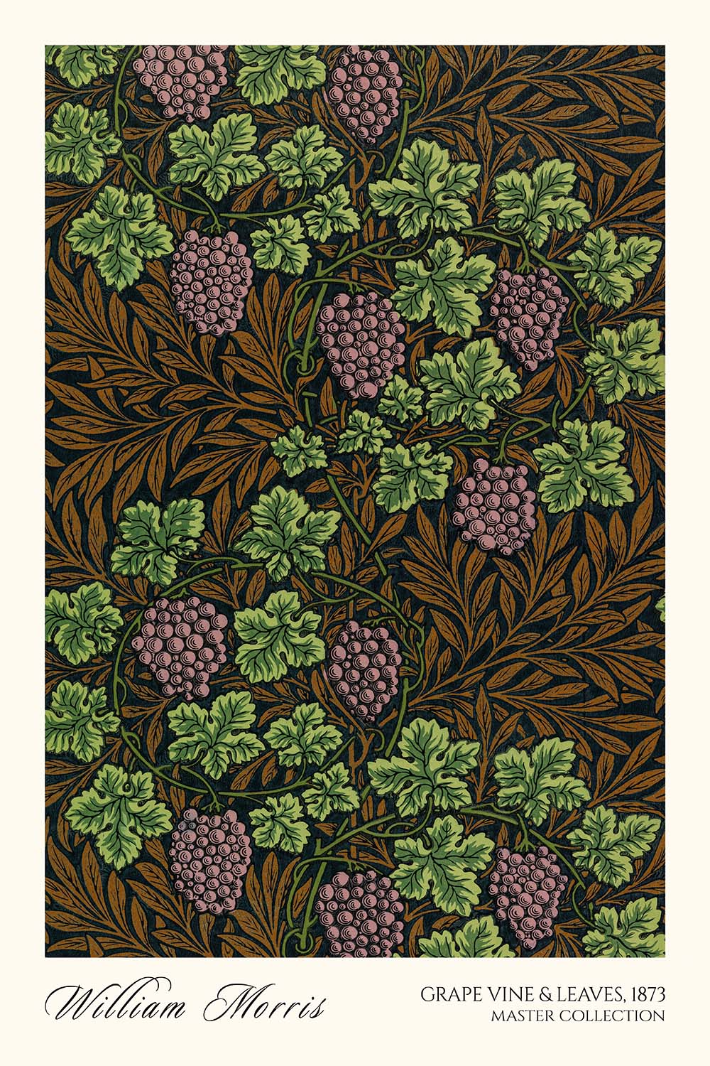 Grape Vine & Leaves by William Morris (1873) is a richly orchestrated decorative pattern from the heart of the British Arts & Crafts movement. Conceived at a time when designers sought to reconnect everyday life with handcraft and nature, the design entwines grape clusters and curling tendrils in a lyrical repeat that feels both timeless and modern. Created during Morris’s most prolific years, this motif carries the elegance and integrity that made Morris & Co. a byword for fine wallpapers and textiles.