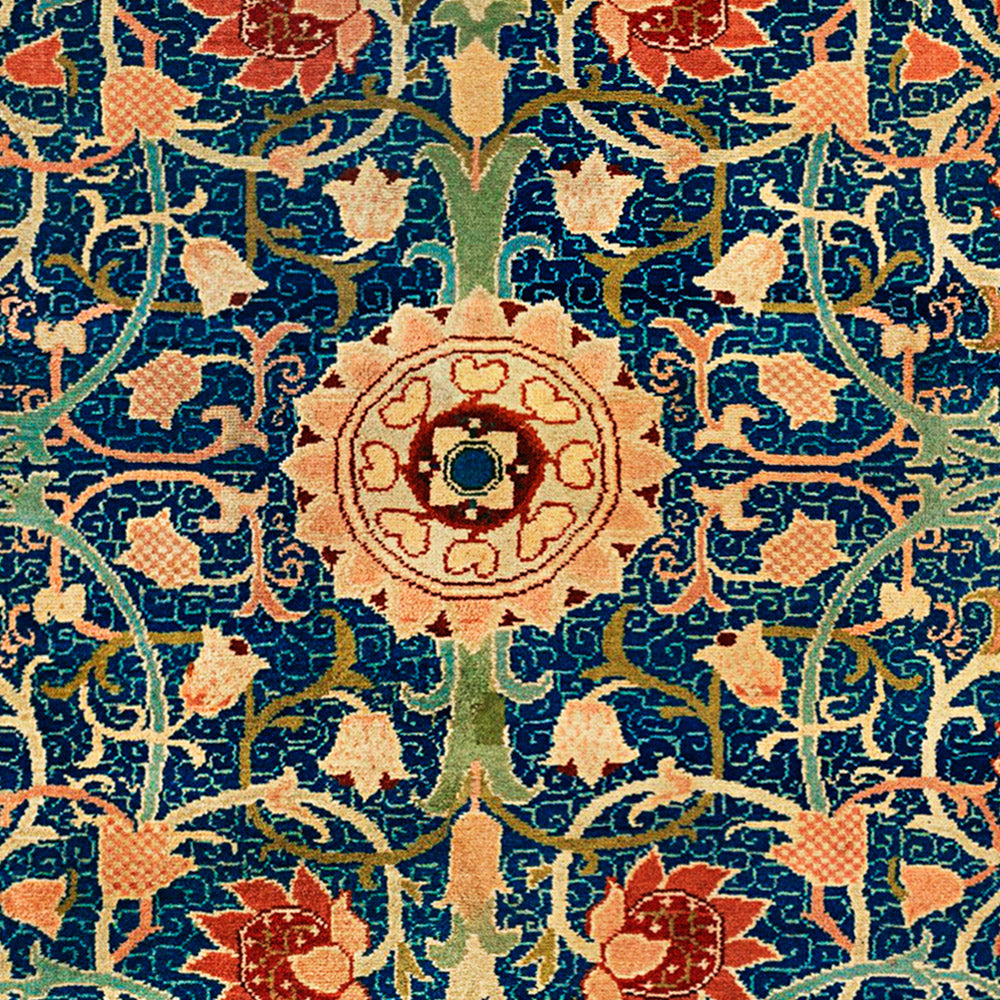 The Holland Park Carpet design exemplifies Morris’s fascination with classical Persian weaving, particularly the floral arabesques and structured medallion layouts associated with Safavid-era textiles. The field is animated by scrolling stems, clustered rosettes, and palmette-like forms that radiate with calm symmetry. Repetition and mirrored balance create a sense of paradise garden order—an endlessly renewing pattern that invites the eye to wander while remaining centered and serene.