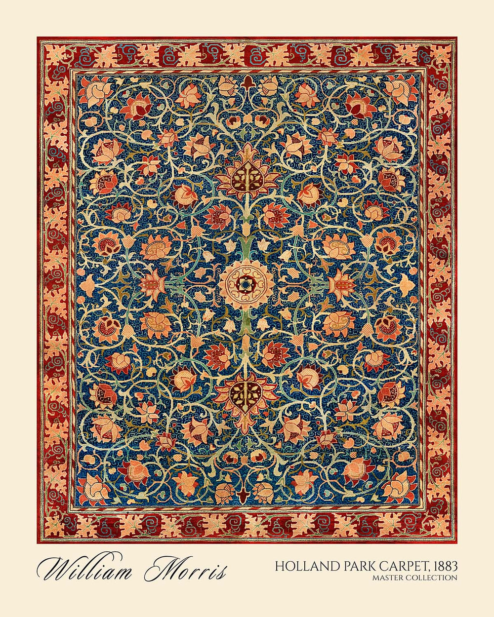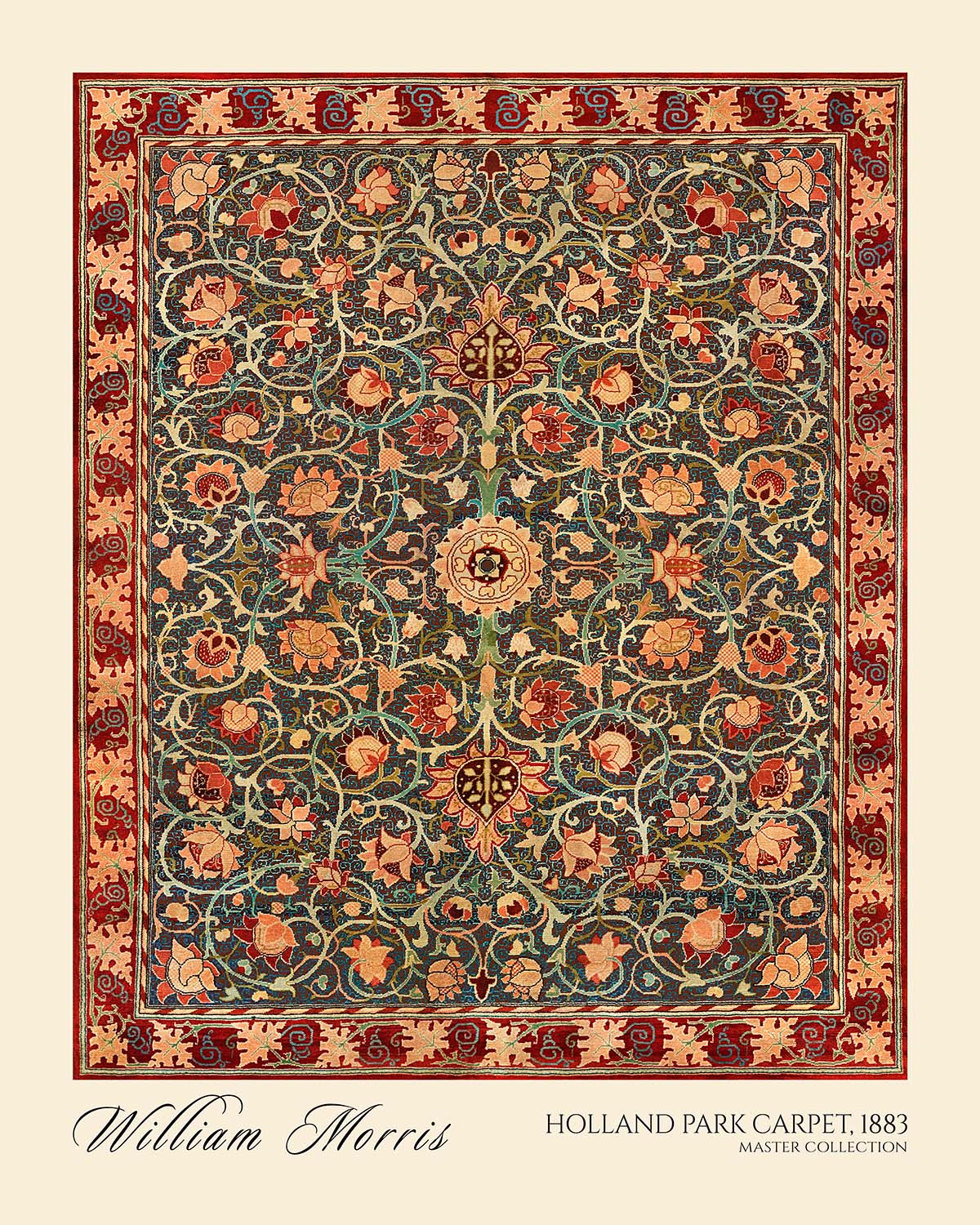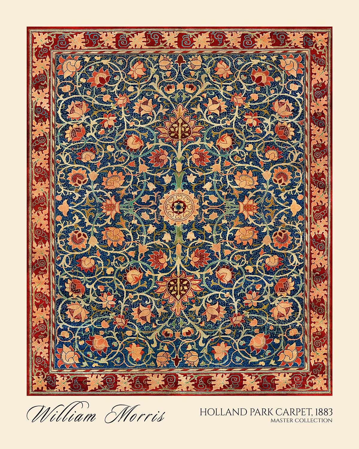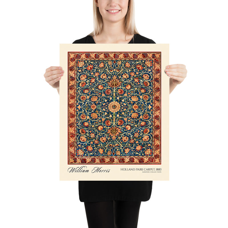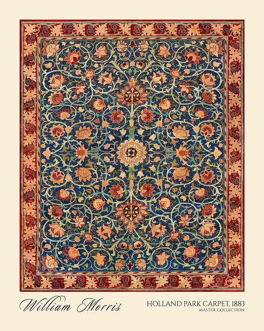 Holland Park Carpet by William Morris (1883) is a restored, high-quality print of an original Morris design—most likely conceived as a wallpaper pattern, though it may also have been adapted for a carpet, curtain, or other textile. Drawing on the grandeur of Persian carpet traditions that Morris so admired, this motif orchestrates a garden of stylized blooms and curling vines around a poised, medallion-like structure. It channels the late-19th-century Arts & Crafts ethos: refined craft, natural forms, and ornament that turns everyday surroundings into a place of delight.