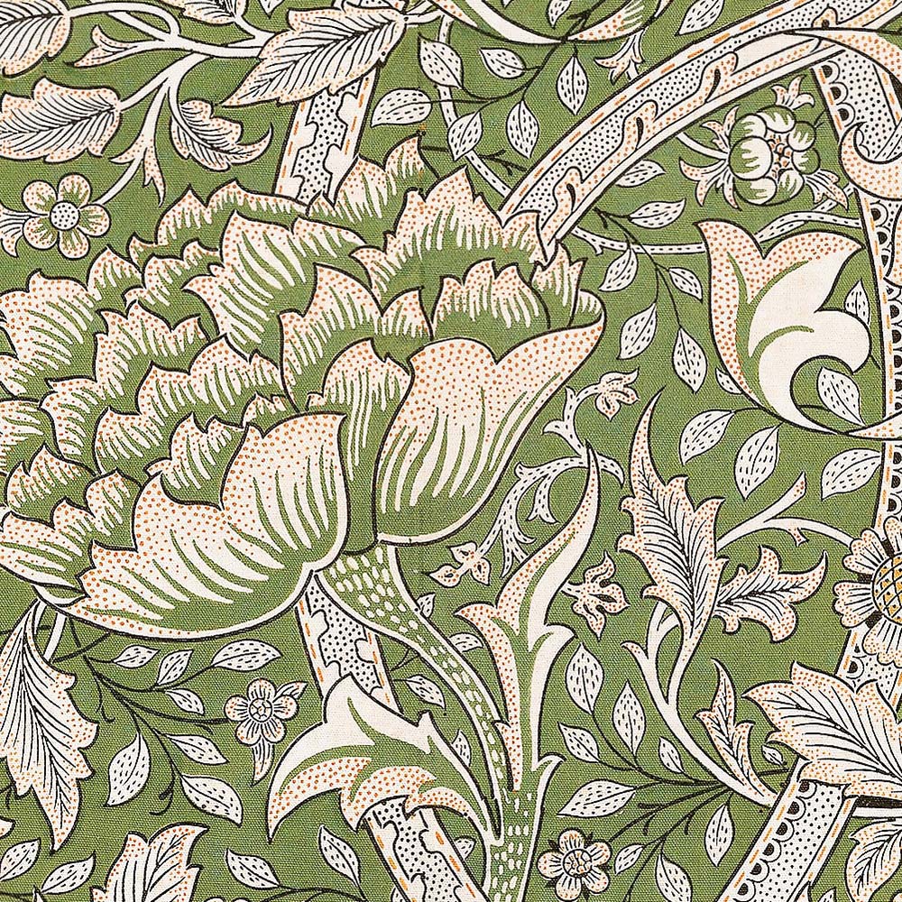 The palette carries the spirit of Arts & Crafts interiors. Dominant green offers a calming, botanical foundation; second notes of beige create a warm, understated field; and highlights of yellow brighten the blooms and leaf tips with gentle radiance. Together they give Windrush a versatile character—equally at home in heritage settings with wood and stone, or as a graceful counterpoint in modern spaces. It’s a pattern to live with: soothing from afar, richly intricate up close.