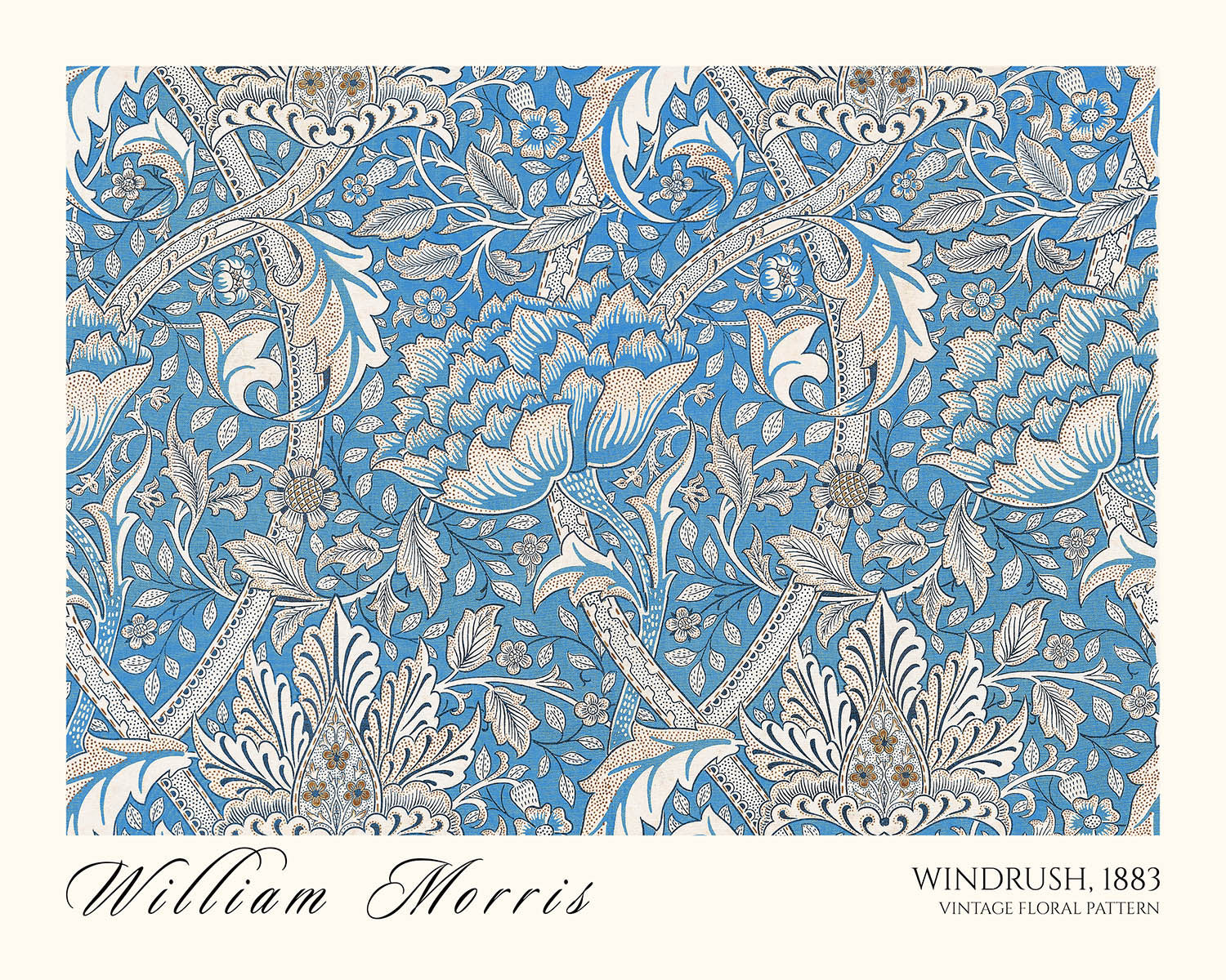 Windrush by William Morris (1883) is a quintessential Arts & Crafts pattern that channels the grace of the English countryside into a rhythmic, repeating design. This restored fine art print revives Morris’s original vision with crisp detail, revealing a luxuriant tangle of blossoms, scrolling foliage, and tender stems. Likely conceived for wallpaper—and equally suited to carpet, curtain, or other textile—Windrush embodies the movement’s celebration of nature and the hand of the artisan.