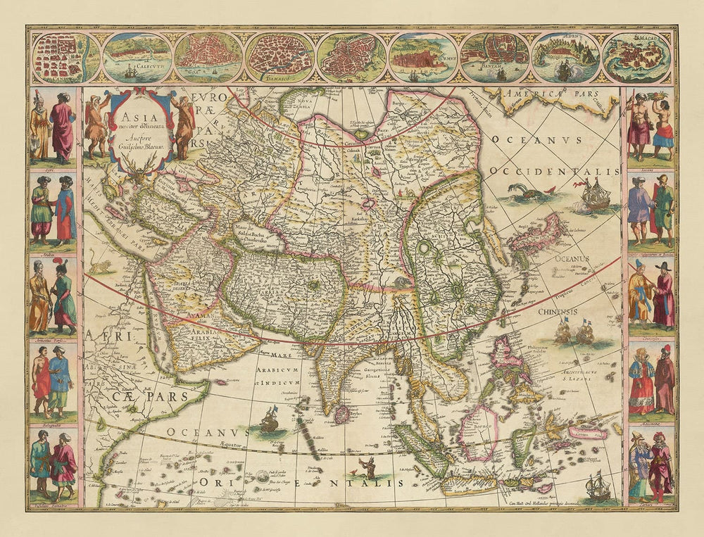 A truly superb 17th century map of Asia by master mapmaker Willem Blaeu. Blaeu had access to the charts of the Dutch East India Company, and thus this map was the most accurate of its time.