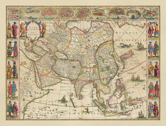 Around the map are silhouettes of the people of Asia and how they dressed at the time, and across the top of the map are detailed maps of nine cities that Europe traded with at the time: Kandy, Calcutta, Goa, Damascus, Jerusalem, Hormuz, Bantam, Aden, and Macao.