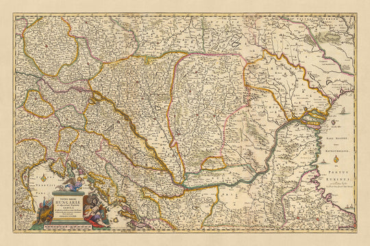 Old Map of Kingdom of Hungary by Visscher, 1690: Budapest, Vienna, Zagreb, Bucharest, Bratislava