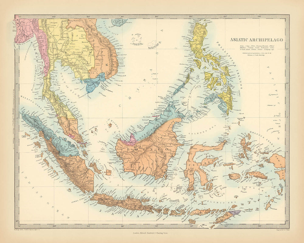 The "Asiatic Archipelago" map, crafted in 1872 by the esteemed Society for the Diffusion of Useful Knowledge (SDUK), is a captivating representation of the intricate geography and political landscape of Southeast Asia during the late 19th century. Known for their dedication to making educational materials accessible, the SDUK produced this map to enlighten the public about the complex archipelagos of the region. The map reflects the colonial interests and geopolitical understanding of the time, offering a window into a world where maritime routes and territorial boundaries were of paramount importance.