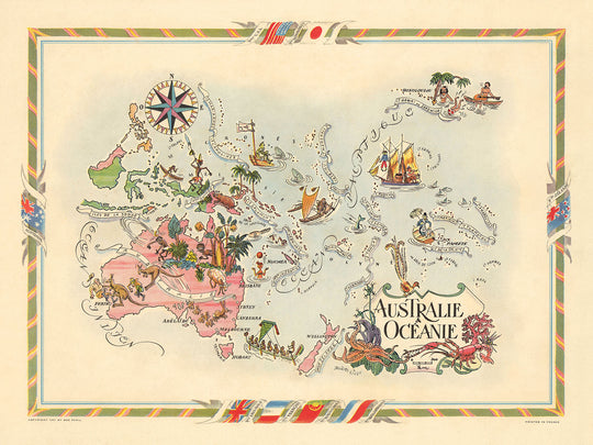 Historically, the "Australie & Océanie" map serves as a testament to the cartographic and cultural knowledge of the 1950s. It reflects the era's exploration and understanding of distant lands, offering a snapshot of how these regions were viewed and represented. The annotations and illustrations provide a rich tapestry of historical and cultural elements, making this map not only a tool for navigation but also a piece of art that tells the story of Australia and Oceania. This map is a perfect addition for collectors and enthusiasts who appreciate the intersection of geography, history, and art.