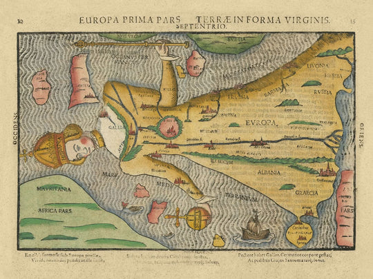 "Europa Prima Pars Terrae In Forma Virginis" is a captivating masterpiece by the renowned Protestant theologian Heinrich Bunting, crafted in 1616. This extraordinary map presents Europe as a regal queen, a unique anthropomorphic depiction that has intrigued historians and collectors alike. Bunting's work reflects the rich tapestry of 16th-century European politics and religion, capturing the continent's essence in a manner both artistic and symbolic. This map is not merely a geographical representation but a narrative of power, faith, and identity, showcasing Europe in a form that speaks to its historical and cultural significance.