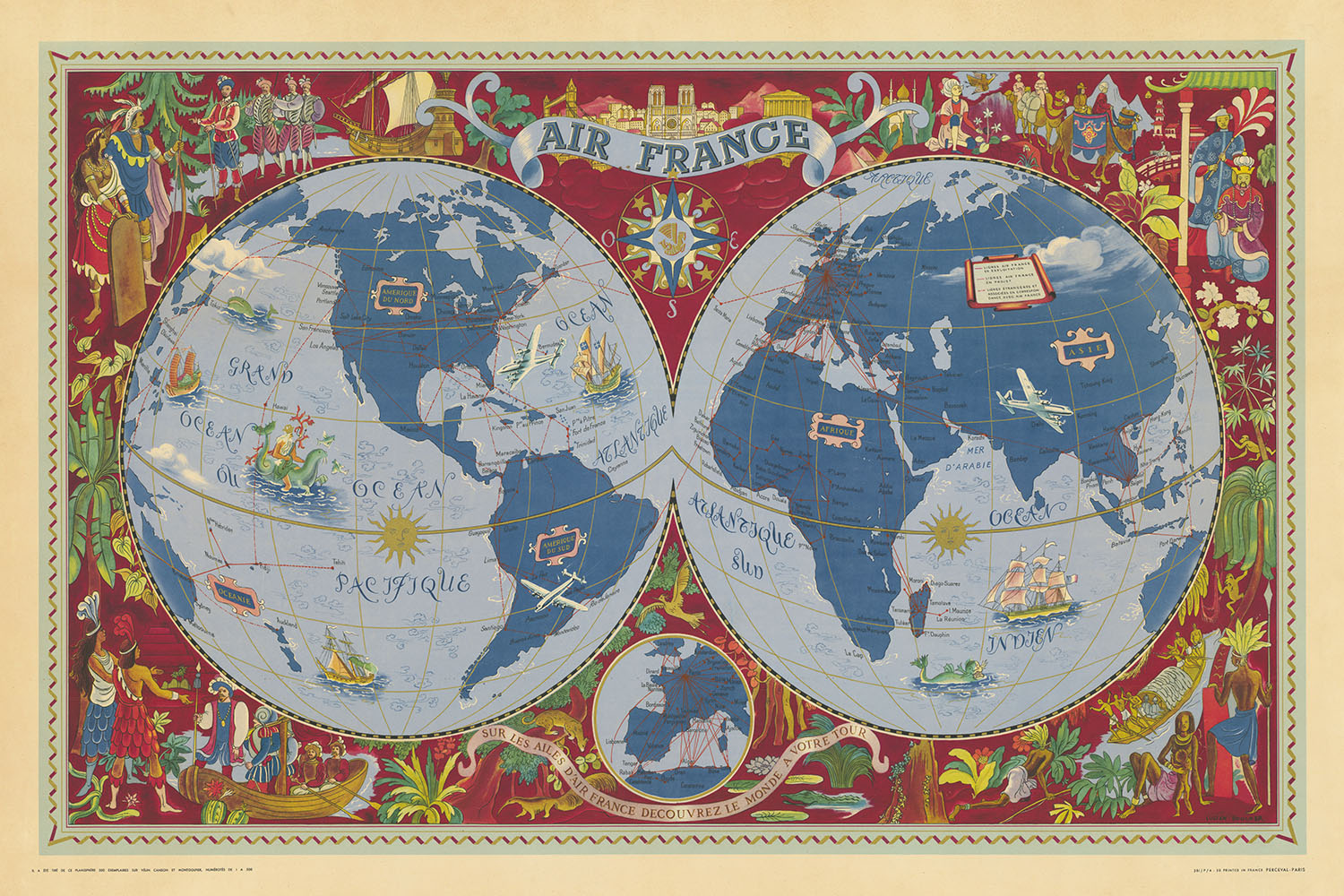 - Design or style context: The map is characterized by a decorative and pictorial style, reflecting the commercial promise of Surrealism. It includes vibrant illustrations and a detailed depiction of Air France's global routes.