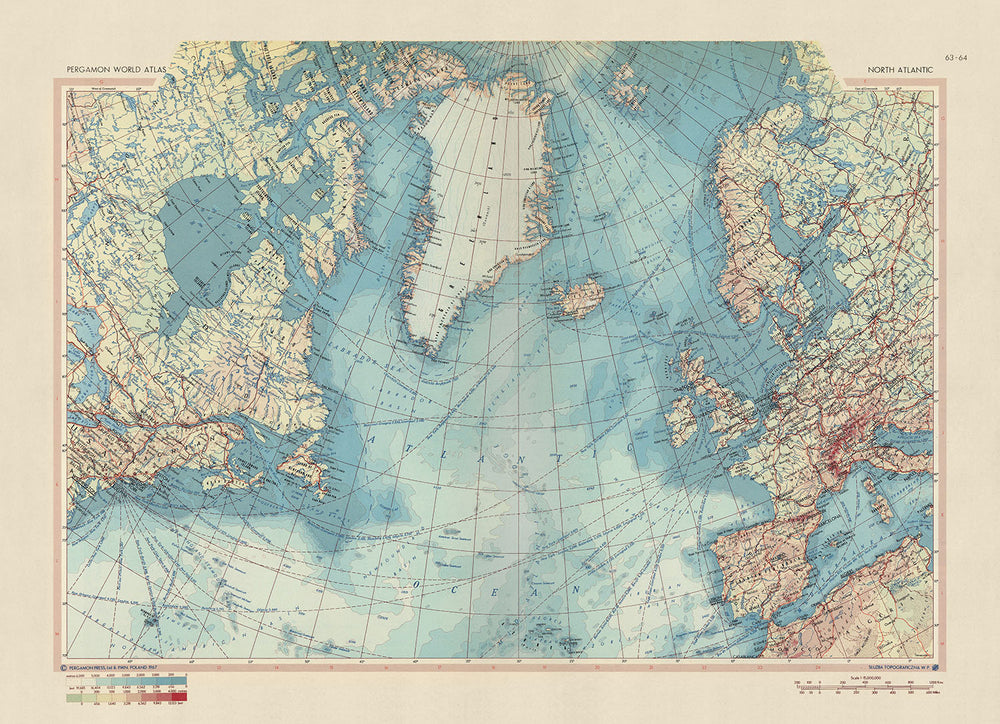 Old World Map of North Atlantic, 1967: Maritime Trade Routes, Canada, Greenland, Iceland, Europe