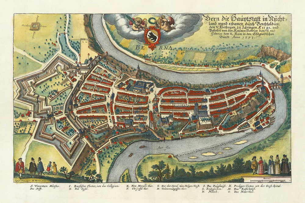 Alte Karte von Bern im Jahr 1645 von Merian Matthaus: 300. Jahrestag der Schweizerischen Eidgenossenschaft