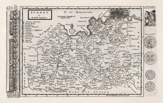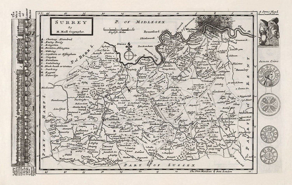 Moll's County Maps sind mit interessanten Ansichten und Kuriositäten geschmückt - in diesem Fall eine detaillierte Gravur der Londonbrücke links, einige sächsische Münzen und ein Janus-Kopf, der anscheinend in der Nähe von Peckham gefunden wurde.