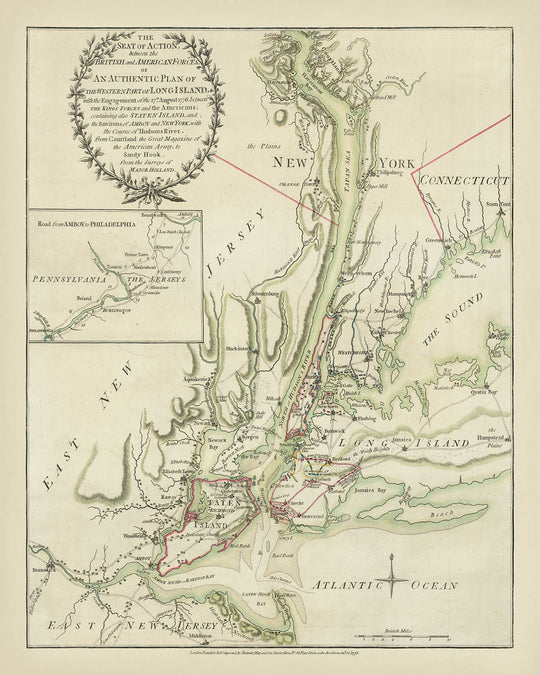 - Name der Karte: Der Schauplatz der Aktion zwischen den britischen und amerikanischen Streitkräften. Oder ein Authentischer Plan des westlichen Teils von Long Island, mit dem Gefecht vom 27. August 1776 zwischen den Königstruppen und den Amerikanern . . . aus Vermessungen von Major Holland.