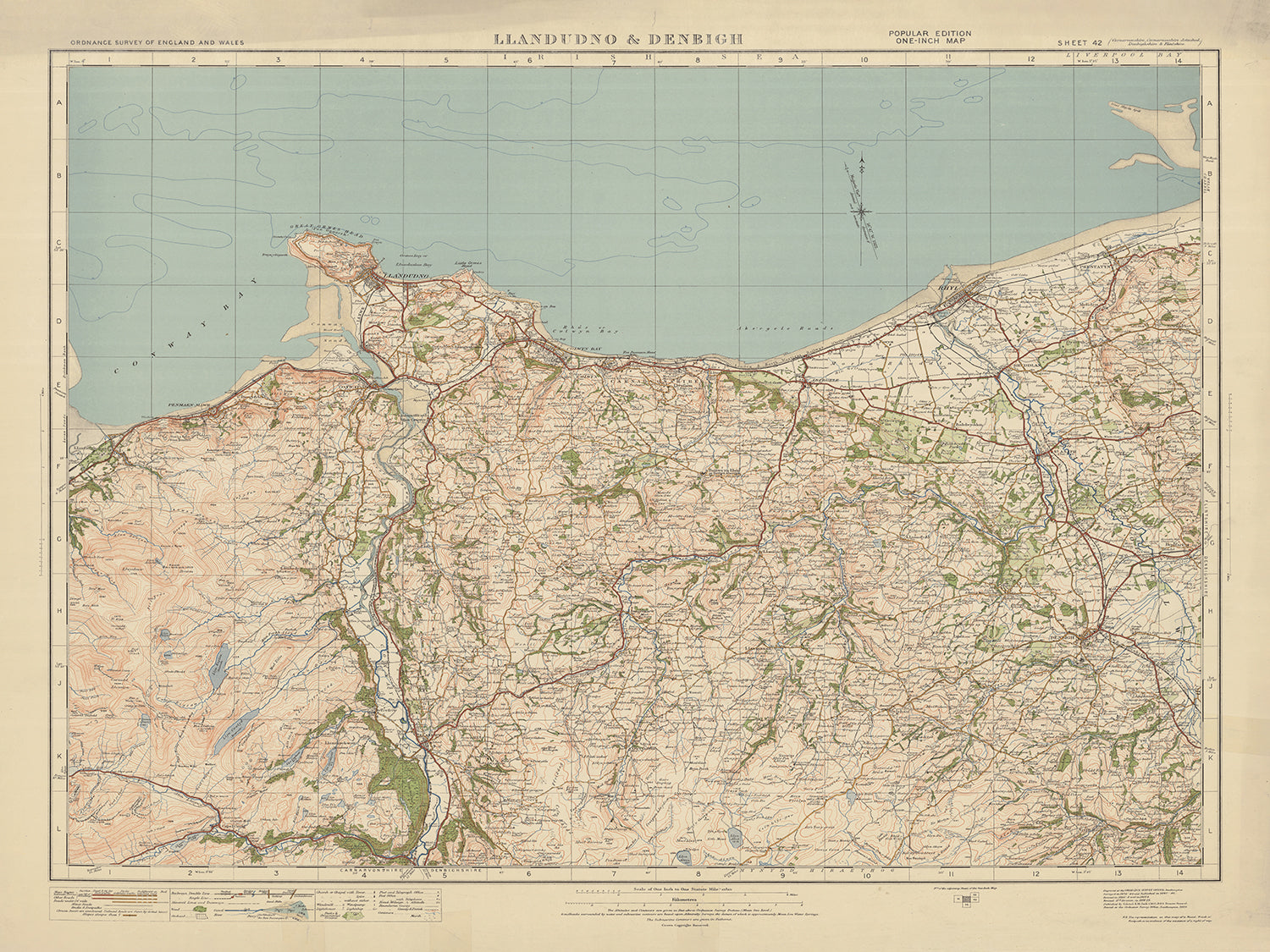 Die „Old Ordnance Survey Map, Blatt 42 – Llandudno & Denbigh, 1925“ bietet einen fesselnden Einblick in die Vergangenheit und zeigt die Städte und bemerkenswerten Sehenswürdigkeiten der Region. Diese sorgfältig gestaltete Karte, Teil der von Ordnance Survey herausgegebenen One-Zoll-Ausgabe „Popular“ von England und Wales, ist ein wertvolles historisches Artefakt, das Geschichtsinteressierten, Kartografieliebhabern und allen, die sich für die Vergangenheit der Region interessieren, eine Fülle von Informationen bietet .