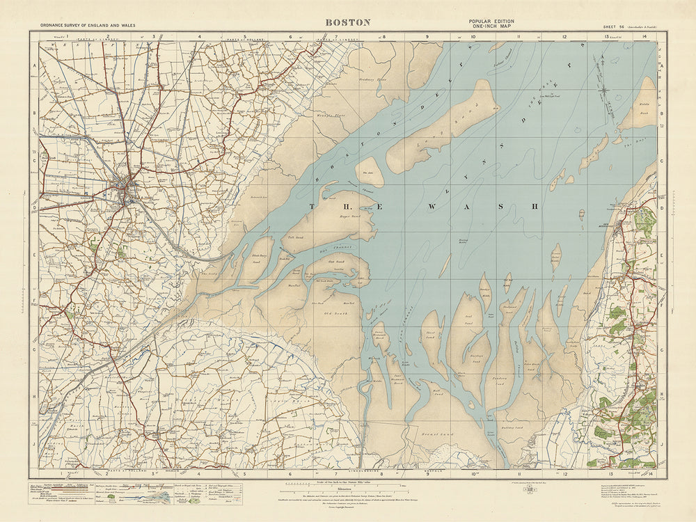 Die Karte „Blatt 56 – Boston“ aus der One-Zoll-Ausgabe „Popular“ von Ordnance Survey, England und Wales, veröffentlicht 1925, ist ein bemerkenswertes Stück kartografischer Geschichte. Diese Karte zeigt die Stadt Boston und ihre Umgebung und bietet einen faszinierenden Einblick in die Vergangenheit. Die Karte zeigt mehrere Städte und interessante Merkmale, darunter Hunstanton, Heacham, Dersingham, Old Leake und Wrangle.