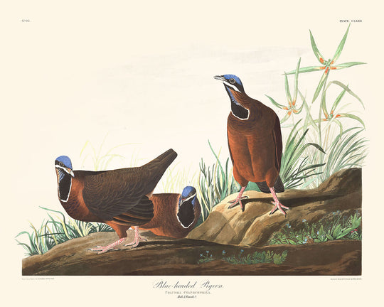 Die Blaukopf-Taube, erstmals 1827 veröffentlicht, ist eine der faszinierendsten Illustrationen aus John James Audubons Meisterwerk, Die Vögel Amerikas. Einige dieser Vögel migrieren jeden Frühling von der Insel Kuba zu den Keys von Florida, werden jedoch aufgrund der verworrenen Wälder, die sie bewohnen, selten gesehen. Audubon hat drei dieser Tauben sorgfältig am Boden dargestellt, umgeben von den kriechenden Pflanzen, die in den Keys heimisch sind.