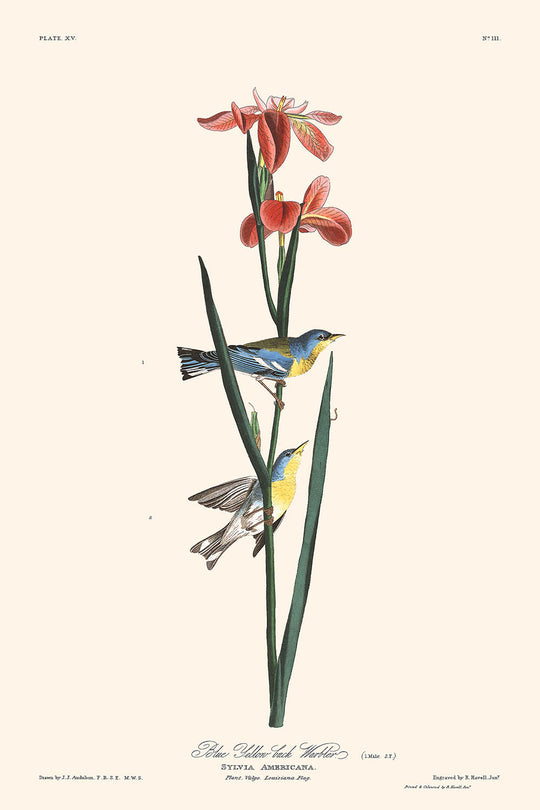Der Blau-Gelb-Rücken-Waldsänger, erstmals 1827 veröffentlicht, ist eine auffällige und zarte Illustration aus dem renommierten Werk von John James Audubon, Die Vögel Amerikas. Diese bezaubernde Illustration fängt den lebhaften Blau-Gelb-Rücken-Waldsänger ein, der zwischen lebhaften Irisblüten sitzt, ein Markenzeichen von Audubons unvergleichlichem Können in der Darstellung des Vogellebens.