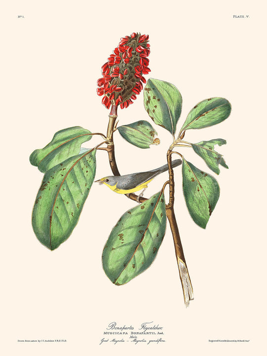 Der Bonaparteschnäpper (Tafel 5), erstmals veröffentlicht von John James Audubon im Jahr 1827, ist ein faszinierendes und seltenes Juwel aus seinem monumentalen Werk, Vögel von Amerika. Diese aufwendige Illustration erweckt den schwer fassbaren Bonaparteschnäpper zum Leben und fängt seine einzigartigen Farben und Verhaltensweisen ein. Audubon benannte diesen Vogel nach dem angesehenen Naturforscher Charles Lucien Bonaparte, obwohl er nur begrenzte Informationen über die Gewohnheiten des Vogels hatte, da er ihm nur einmal begegnete.