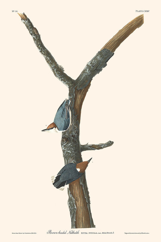 Diese spezielle Illustration des Braunkopf-Waldsängers sticht durch ihre dynamische Darstellung des Verhaltens und des Lebensraums des Vogels hervor. Audubons Verwendung lebendiger Farben und lebensechter Details erweckt den kleinen, agilen Vogel zum Leben. Der Waldsänger wird mit seinen charakteristischen scharfen, hohen Rufen und seinen schnellen, fast erratischen Bewegungen beim Fressen dargestellt, was das Kunstwerk nicht nur visuell ansprechend, sondern auch reich an Verhaltensinsights macht.