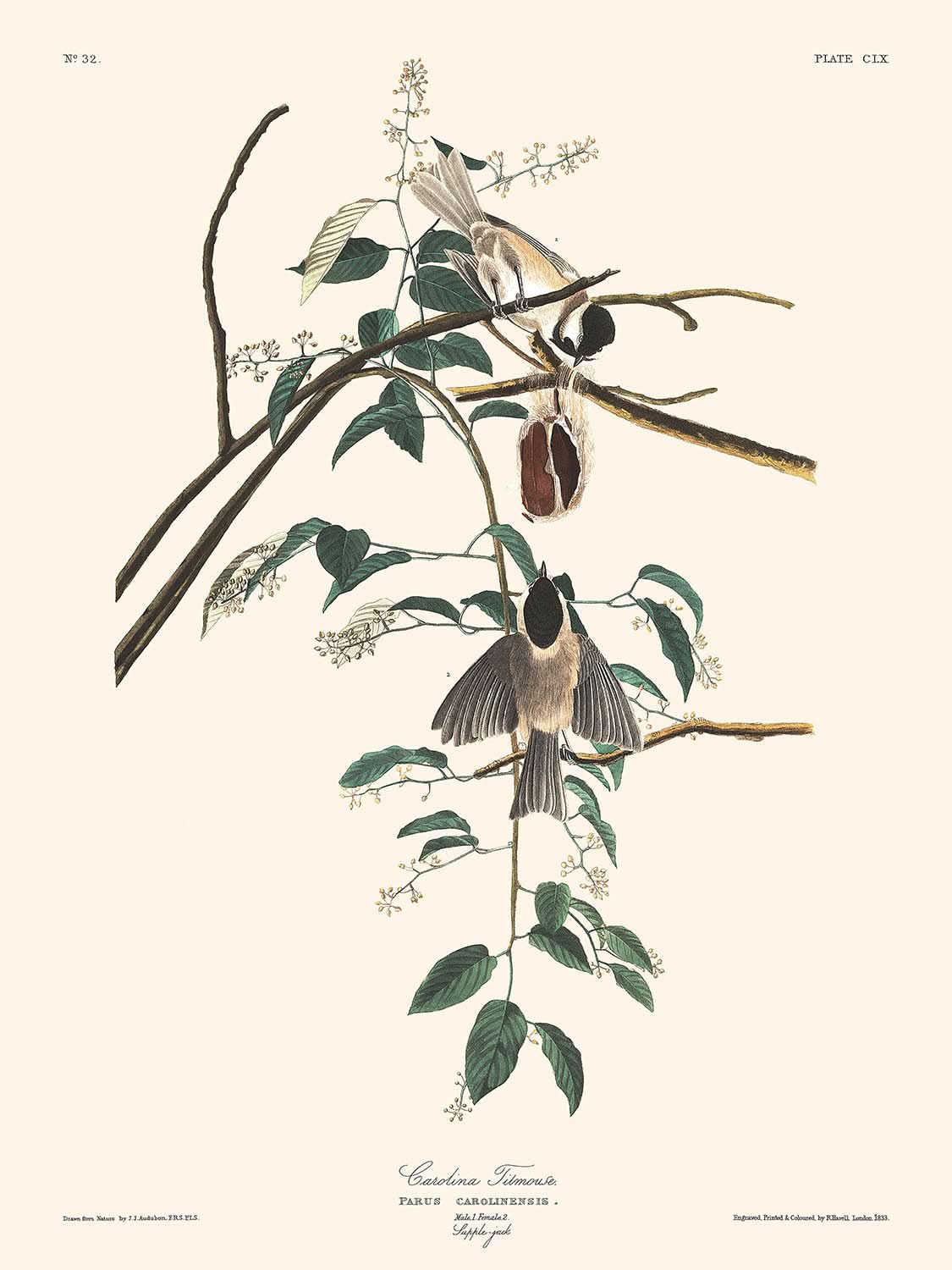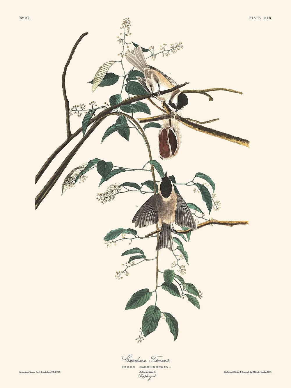 Audubons Verwendung von lebendigen, aber naturalistischen Farben repräsentiert authentisch den Lebensraum des Titmouse, während die akribische Detailgenauigkeit in der Illustration sie zu einer großartigen Ergänzung jeder Kunstsammlung macht. Der Besitz dieses Drucks bedeutet eine Wertschätzung für die Verbindung von Kunst und wissenschaftlicher Erkundung, perfekt geeignet, um jeden Raum mit historischer und ästhetischer Tiefe zu bereichern.