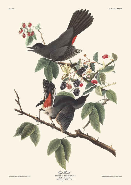 John James Audubons „Katzenvogel“, ursprünglich 1827 als Tafel 128 der berühmten „Birds of America“ veröffentlicht, fängt das lebhafte Wesen dieses bezaubernden Singvogels ein. Audubon, eine bedeutende Persönlichkeit der Naturgeschichte, hat den Katzenvogel mit akribischer Detailtreue und charakteristischer Anmut dargestellt und so die Eleganz und das verspielte Wesen des Geschöpfs zum Leben erweckt.
