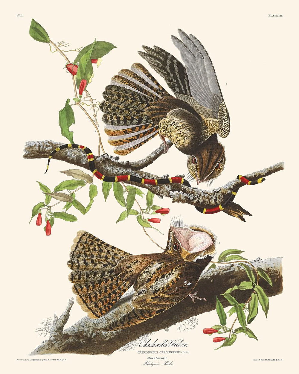 Die Chuckwill-Witwe ist besonders bemerkenswert für ihr faszinierendes Verhalten und ihren einzigartigen Lebensraum, der oft in den tiefen Schluchten und Sümpfen im Südosten der Vereinigten Staaten zu finden ist. Die eindringlichen Rufe dieses Vogels, der wissenschaftlich als Caprimulgus Carolinensis bekannt ist, hallen in der Abenddämmerung durch die Wälder und verleihen seiner Umgebung eine geheimnisvolle und doch beruhigende Qualität. Dieser Druck fängt eine ruhige Nachtszene ein, in der die Vögel mit einer harmlosen Harlekin-Schlange auf einem verrotteten Ast interagieren, und unterstreicht Audubons dynamische Darstellung der Tierwelt.