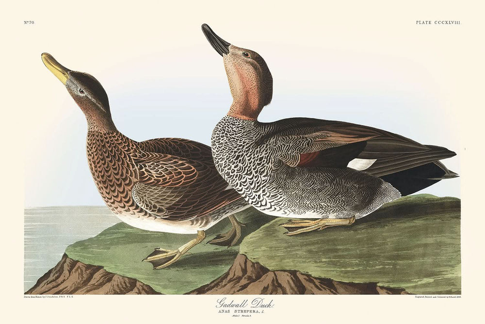John James Audubons „Schnatterente“, erstmals 1827 veröffentlicht, ist eine eindrucksvolle Illustration aus seiner berühmten Sammlung „The Birds of America“. Dieses Kunstwerk fesselt den Betrachter mit seiner lebensechten Darstellung der Schnatterente in ihrer ruhigen Umgebung.