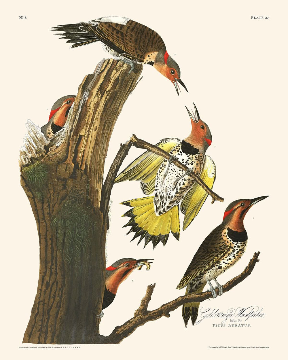 Die Illustration des Goldflügelspechts zeigt die auffällige Färbung und das Verhalten des Vogels. Sie ist nicht nur eine künstlerische Meisterleistung, sondern bietet auch einen Einblick in das lebhafte Leben dieser Spechte, die für ihre dynamische Balz und ihre sozialen Rituale gelobt werden. Über die Ästhetik hinaus dient dieses Werk als pädagogisches Hilfsmittel, das die Bedeutung der Art in verschiedenen Regionen der Vereinigten Staaten und ihre bemerkenswerte Anpassungsfähigkeit veranschaulicht.
