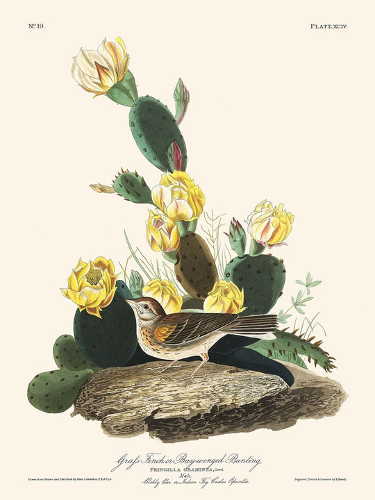 Der Grasfink, oder Bay-winged Bunting, erstmals 1827 veröffentlicht, ist eine fesselnde Vogelillustration aus John James Audubons ikonischem Werk, The Birds of America. Diese zarte Darstellung fängt die subtile Schönheit und elegante Haltung des Grasfinks ein, der zwischen natürlichem Laub nistet.