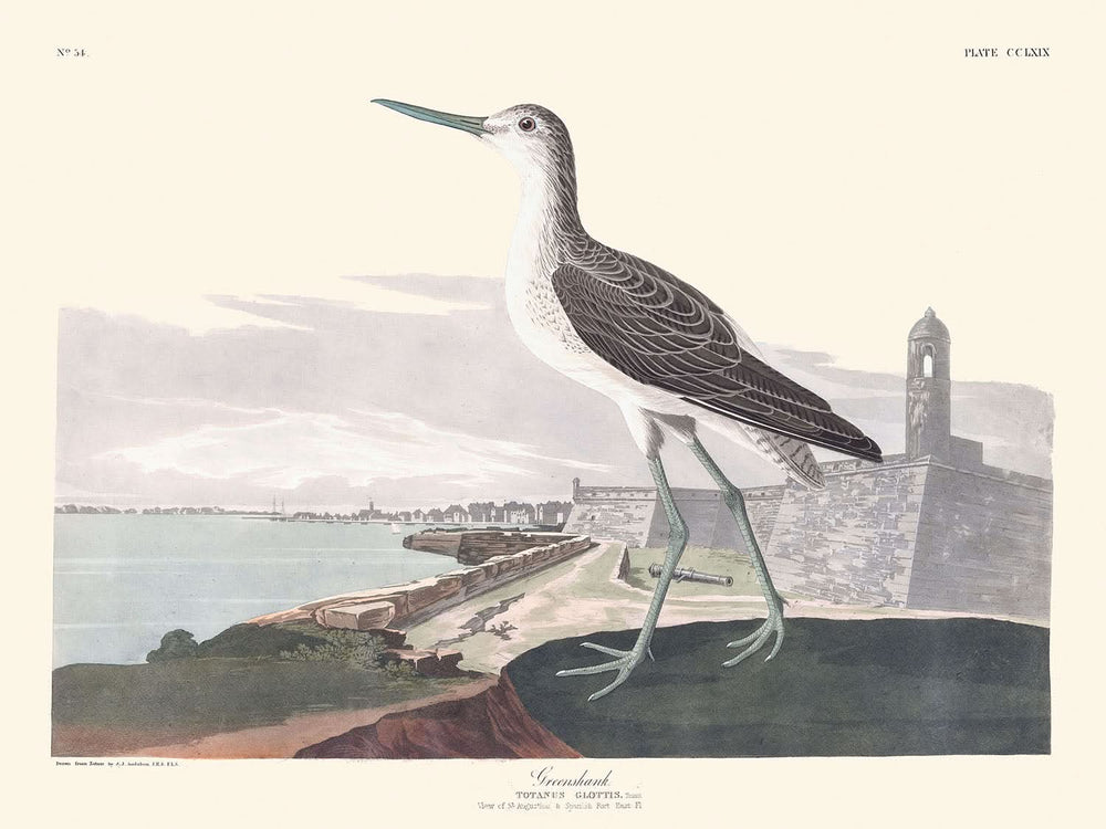 „Greenshank“, gemalt vom legendären Ornithologen John James Audubon im Jahr 1827, ist Teil seiner gefeierten Serie „Birds of America“. Diese großartige Sammlung stellt eines der größten Werke der Ornithologie und Kunst dar und wird für ihre detaillierten, lebensechten Darstellungen von Vögeln gefeiert.
