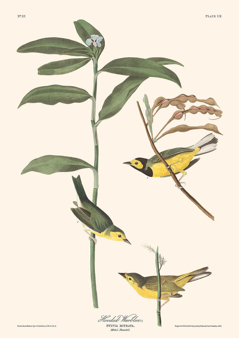 Diese Illustration des Kapuzenwarblers hebt sich nicht nur durch ihre historische Bedeutung hervor, sondern auch durch die lebhaften und charakteristischen Manierismen dieses Vogels. Der Druck zeigt eine sorgfältig gestaltete Szene, die von lebhafter Flora wimmelt und die abgeschiedenen Lebensräume widerspiegelt, in denen der Warbler lebt.
