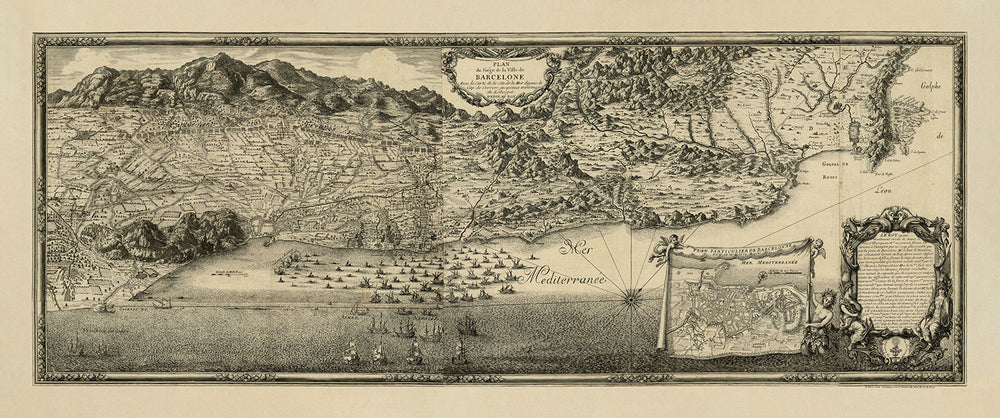 Für Sammler und Geschichtsliebhaber ist diese Karte eine einmalige Gelegenheit, ein Stück Vergangenheit zu besitzen. Die detaillierte Darstellung der Belagerung von Barcelona in Kombination mit ihrer künstlerischen Eleganz macht sie zu einer herausragenden Ergänzung jeder Sammlung. Ob als Blickfang in einem Arbeitszimmer oder bewundert wegen ihres historischen Reichtums, diese Karte bietet eine faszinierende Reise in die Ereignisse und Landschaften, die den Lauf der Geschichte geprägt haben.