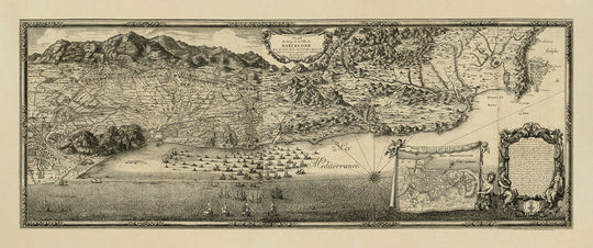 Das Design der Karte spiegelt die reichhaltige kartografische Tradition des späten 17. Jahrhunderts wider und verbindet künstlerisches Flair mit militärischer Präzision. Das bildliche Relief veranschaulicht anschaulich die Topografie der Region und hebt das bergige Gelände und die strategischen Küstenpositionen hervor. Insbesondere enthält die Karte detaillierte Darstellungen von Belagerungslinien, Befestigungen und Seestreitkräften im Mittelmeer und bietet so einen umfassenden Überblick über die Komplexität des Konflikts. Beaulieus Liebe zum Detail erstreckt sich auch auf die künstlerischen Ränder und dekorativen Elemente, die die ästhetische Anziehungskraft und den historischen Wert der Karte steigern.