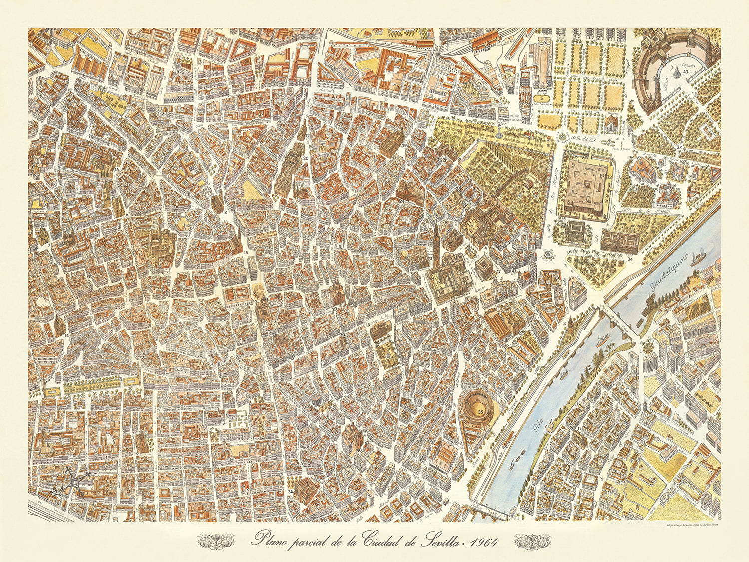 Die Schöpfer dieser Karte, Jose Loeches und Jose Ruiz Navarro, werden für ihre Fähigkeit gefeiert, künstlerisches Flair mit kartografischer Präzision zu verbinden. Ihre Arbeit am „Plano Parcial de la Ciudad de Sevilla“ ist ein Paradebeispiel für ihr Talent und fängt das Wesen der Stadt auf eine Weise ein, die sowohl informativ als auch visuell fesselnd ist. Diese Karte ist nicht nur ein Navigationshilfsmittel, sondern ein Kunstwerk, das den Betrachter einlädt, in die reiche Geschichte und lebendige Kultur Sevillas einzutauchen.