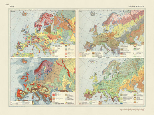 - Die Karte enthält vier kleinere Karten, die jeweils einen anderen Aspekt von Europas Geologie, Geomorphologie, Böden und Vegetation fokussieren.