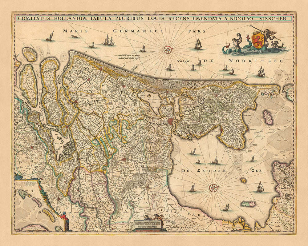 Nicolaes Visscher II., der Schöpfer der Karte, gehörte zur angesehenen Visscher-Familie von Kartographen, Künstlern und Verlegern. Er war der Enkel von Claes Janszoon Visscher, einem der besten Kartographen des Goldenen Zeitalters der Niederlande. Diese Karte ist daher nicht nur eine geografische Darstellung, sondern auch ein Kunstwerk, das das Erbe einer Familie in sich trägt, die maßgeblich zum Goldenen Zeitalter der niederländischen Kartographie beigetragen hat. Mit ihrer historischen und künstlerischen Bedeutung bietet diese Karte eine einzigartige Reise in die Vergangenheit und ist somit eine perfekte Ergänzung für jede Sammlung oder ein aufmerksames Geschenk für Geschichts- und Kartenliebhaber.