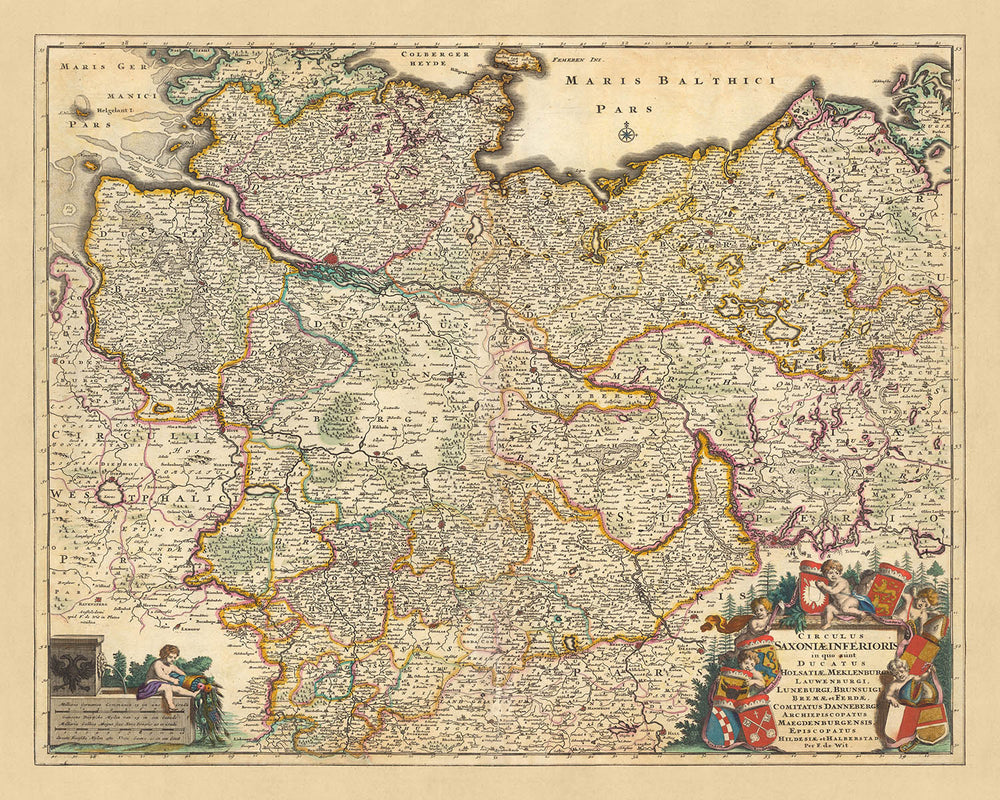 Tauchen Sie ein in die komplizierten Details des „Circulus Saxoniae Inferioris“, einer sorgfältig gestalteten Karte von Nicolaes Visscher II., einem renommierten Kartographen aus dem Goldenen Zeitalter der Niederlande. Dieses exquisite Stück aus dem Jahr 1690 ist ein Beweis für Visschers kartografisches Können und seinen scharfen Blick fürs Detail. Es bietet eine genaue und umfassende Darstellung von Niedersachsen, einer Region, die im heutigen Großraum Deutschland einen bedeutenden Platz einnimmt.