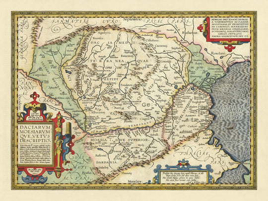 Abraham Ortelius, der renommierte Kartograf, schuf 1603 die "Daciarum, Moesiarumque, Vetus Descriptio", eine Karte, die die historische und geografische Essenz des antiken Daciens und Mösien lebhaft einfängt. Dieses exquisite Stück, Teil von Ortelius' Parergon, dem ersten historischen Atlas der Welt, ist ein Zeugnis seiner tiefen Neugier auf die klassische Antike. Die Karte erstreckt sich von Deutschland im Westen bis zum Schwarzen Meer im Osten und von Osteuropa im Norden bis Griechenland im Süden und illustriert akribisch die Regionen, die dem heutigen Rumänien und Bulgarien entsprechen. Ortelius' Engagement für historische Genauigkeit und Detail ist in jedem Aspekt dieser Karte offensichtlich, was sie zu einem wertvollen Artefakt für Historiker und Sammler macht.