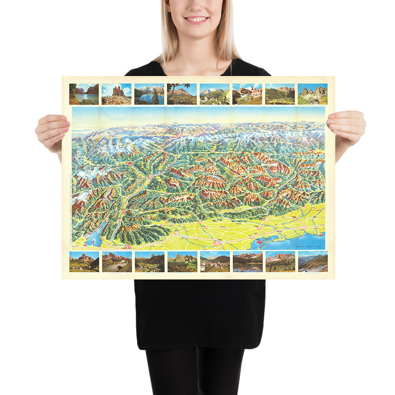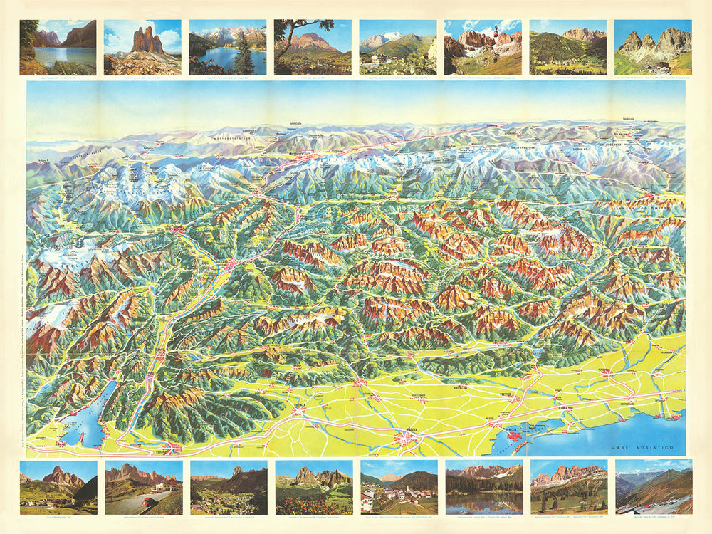 Casa Editrice Tabacco’s 1973 Carta Panoramica e Carta Stradale of the Dolomiti–Tirolo region is a sumptuous celebration of the high Alps at the height of the motor-touring era. Composed in a vivid bird’s-eye perspective, it sweeps from northern Italy into southern Austria, revealing serrated ridgelines, glacier-fed valleys, and orderly towns in luminous color. Relief shading models every crest and couloir, while a finely labeled network of roads guides the eye from Cortina d’Ampezzo to Bolzano, Merano, and Bruneck. Around the margins, photographic vignettes spotlight the region’s most beloved vistas, echoing the map’s mission: to entice travelers onto Alpine roads and into the great amphitheater of the Dolomites. It is cartography expressly made to stir wanderlust.