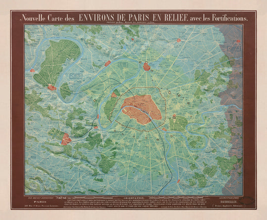 Tauchen Sie ein in die reiche Geschichte der französischen Hauptstadt mit dieser faszinierenden alten Reliefkarte von Paris, die Mitte des 19. Jahrhunderts vom renommierten Kartographen Georg Bauerkeller sorgfältig angefertigt wurde. Dieses kartografische Meisterwerk im Vintage-Stil zeigt nicht nur die Stadt Paris, sondern stellt auch die umliegenden Regionen detailliert dar und bietet so eine lebendige Momentaufnahme der Gegend in einer Zeit großer Veränderungen und Innovationen. Mit ihren aufwendigen Details und ihrer historischen Bedeutung ist diese Karte ein Muss für Geschichtsinteressierte, Kartografieliebhaber und Liebhaber von Paris gleichermaßen.