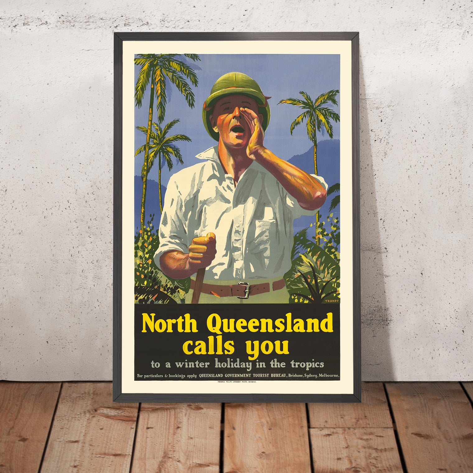 About the artwork and its place: This design invites southerners and overseas visitors northward to Queensland’s tropical belt—Cairns, the Whitsundays, the Daintree, and the islands edging the Great Barrier Reef—where the “winter” is mild, bright and blue. Though made in 1930, the composition borrows the directness of contemporary publicity and propaganda: a central figure calls out to the viewer, palms unfurl in stylized arcs, and the message is immediate. It’s a snapshot of how Australia first marketed its natural wonders to a world eager for new frontiers of leisure.