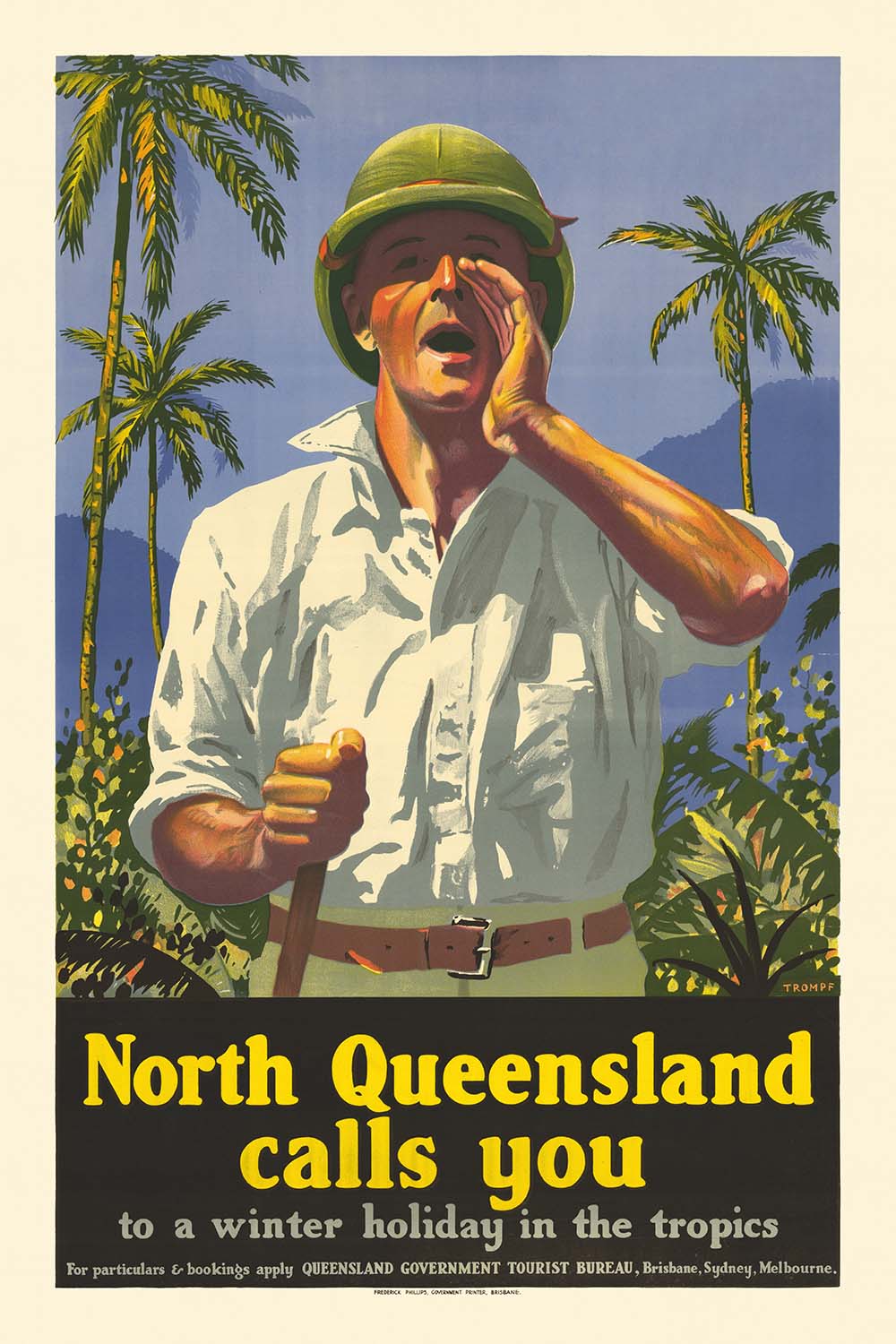 North Queensland Calls You to a Winter Holiday in the Tropics by Percy Trompf (1930) captures the golden promise of Australia’s far north just as modern tourism was taking flight. Trompf, one of the great voices of Art Deco advertising, distilled the allure of Queensland into a single, vivid message: blue seas, lush palms, and an irresistible call to escape winter for the tropics. Created at the height of the interwar boom in promotional art, this poster blends streamlined geometry and bold color to celebrate sunshine, sea breezes and outdoor adventure—imagery that helped define Australian leisure for the world.
