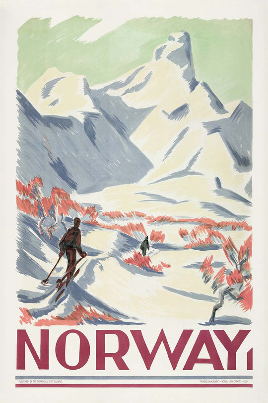 Norway by Norsk lithografisk Officin (1930) is a classic interwar travel poster that distills the exhilaration of Norwegian winter into a sleek modernist scene. Angular alpine peaks and sweeping snowfields frame stylized skiers in motion, while a crisp palette—dominated by blue and white with lively red accents—channels the cool clarity of high mountains and the energy of the slopes. Created at a time when national tourism campaigns were flourishing, this design captures the promise of Norway’s great outdoors in a single, confident image.