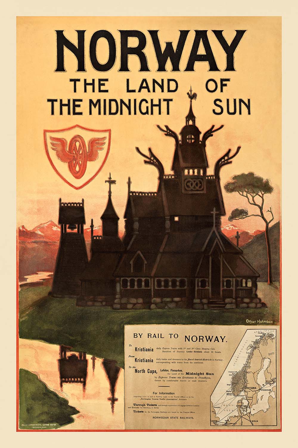 Norway – the Land of the Midnight Sun by Othar Holmboe (1905) is a luminous Art Nouveau travel poster that invites the viewer north to a realm of long summer light, carved timber churches and mountain-green landscapes. Created at the dawn of modern tourism—and the very year Norway affirmed its independence—this design blends national heritage with the promise of comfortable, contemporary travel. Holmboe’s poster captures the romance of rail journeys to a land where the sun lingers above the horizon, making Norway feel both timeless and thrillingly new.