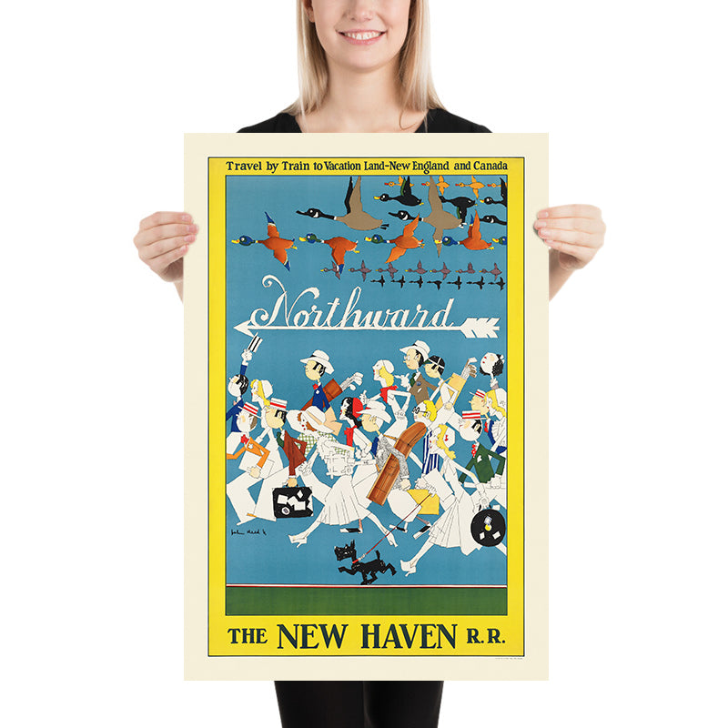 Northward is notable as a snapshot of the burgeoning leisure culture that travel posters helped to create. Its cast of characters—each poised for adventure with luggages and gear—embodies the idea of heading “up” to cooler climes, lakes, forests, and coastlines. The upward-tilting arrow and the flock of ducks together compose a visual itinerary: a shared journey, a brisk departure, the pull of nature and fresh air. It’s a clever, minimal narrative that captures the allure of going north for holidays, whether to New England and the Great Lakes, Canada, Scandinavia, or Alaska.