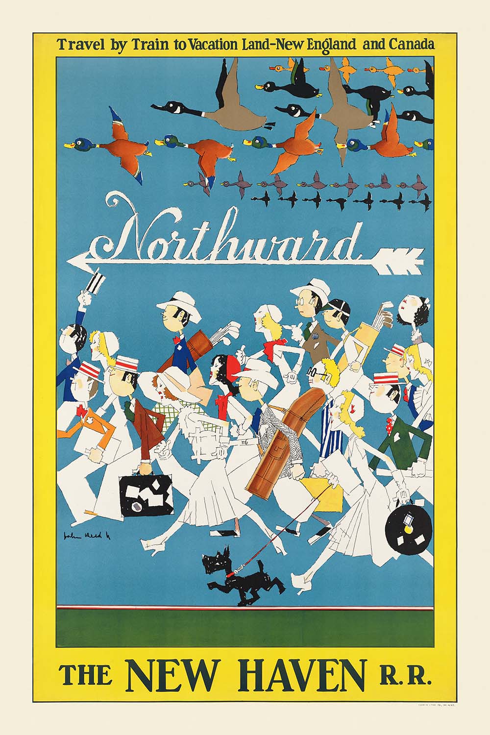 Northward by John Held, Jr. (1910) invites the viewer into the spirit of early 20th-century travel—forward-looking, sociable, and delightfully modern. Best known for his Jazz Age illustrations, Held turns his sharp, witty eye toward tourism, arranging a procession of holidaymakers striding toward a bold directional arrow while a skein of ducks arcs overhead. The result is a quintessential travel poster: brisk, buoyant, and brimming with the optimism of a world newly on the move.