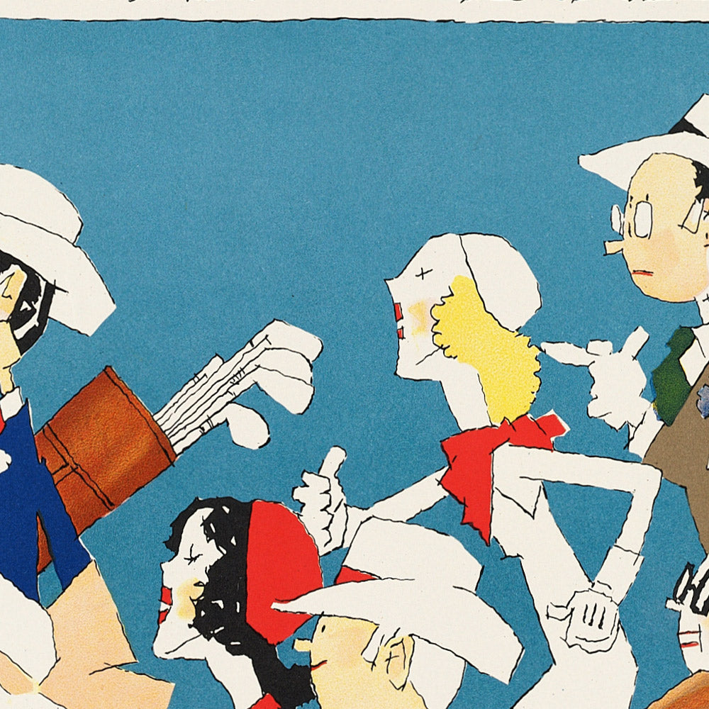 Color and form are the stars here. A turquoise field sets a breezy, sunlit tone, contained by a bright yellow border that frames the action and adds warmth. The palette leans clean and graphic—white, blue, and yellow—while simple patterns on clothing lend individuality without cluttering the composition. Geometric, streamlined figures march in unison, rendered with flat outlines and minimal shading for a distinctly Art Deco sensibility. The diagonal sweep of the procession creates momentum, making this a striking focal point for modern, coastal, or Scandinavian-inspired interiors.