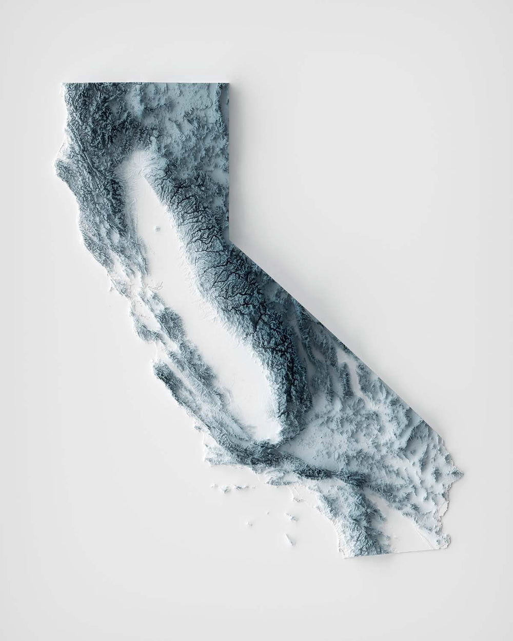 Kalifornien, wenn es auf diese einzigartige Weise präsentiert wird, offenbart dramatisch seine topografischen Höhepunkte. Am offensichtlichsten ist natürlich das Great Valley, das Sacramento Valley und das San Joaquin Valley in der Mitte, umgeben von den massiven Gipfeln der Sierra Nevada im Osten und den erhöhten Coast Ranges im Westen.