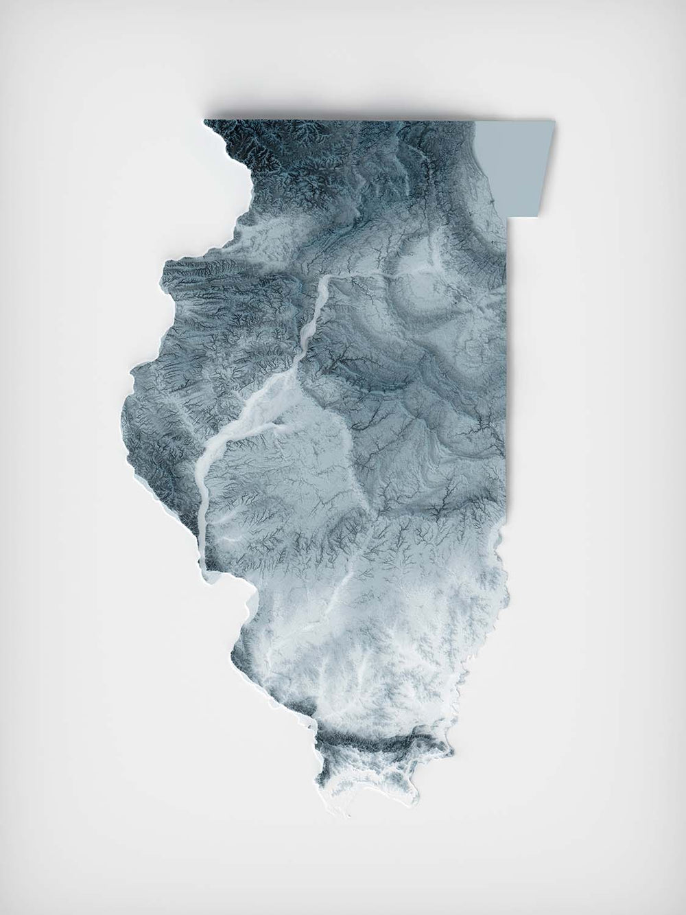 Feiern Sie das Herzland Amerikas mit dieser exquisiten Darstellung von Illinois – einem Bundesstaat, in dem sich weitläufige Ebenen mit von Gletschern geformten Höhenzügen treffen und Flusstäler tiefgreifende Geschichten in die Landschaft eingravieren. Die Karte zeigt die charakteristische Geografie von Illinois mit dramatischer Nutzung von Schatten und Licht, um die sanften Wellen und subtilen Höhenunterschiede zum Leben zu erwecken.