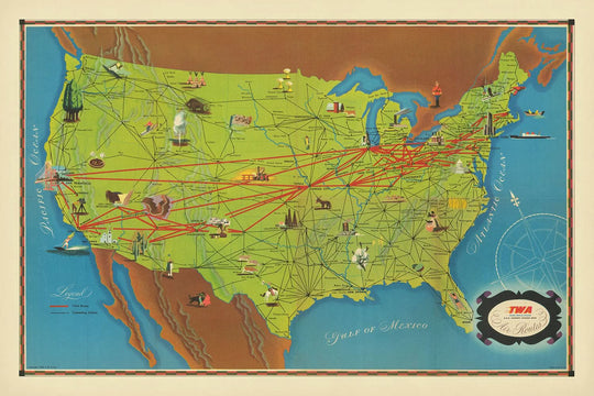Die Karte zeigt die Vereinigten Staaten detailliert und hebt wichtige Städte wie New York, Los Angeles und Chicago hervor. Diese geschäftigen Metropolen waren zentrale Knotenpunkte im Netzwerk von TWA und dienten als Tore zur Welt. Die Karte zeigt auch ikonische Wahrzeichen wie die Golden Gate Bridge und den Grand Canyon und verleiht so einen Hauch des amerikanischen Kultur- und Naturerbes. Die Einbeziehung dieser Elemente steigert nicht nur die ästhetische Anziehungskraft der Karte, sondern bietet auch einen Einblick in die vielfältigen Landschaften und Attraktionen des Amerikas der Mitte des 20. Jahrhunderts.